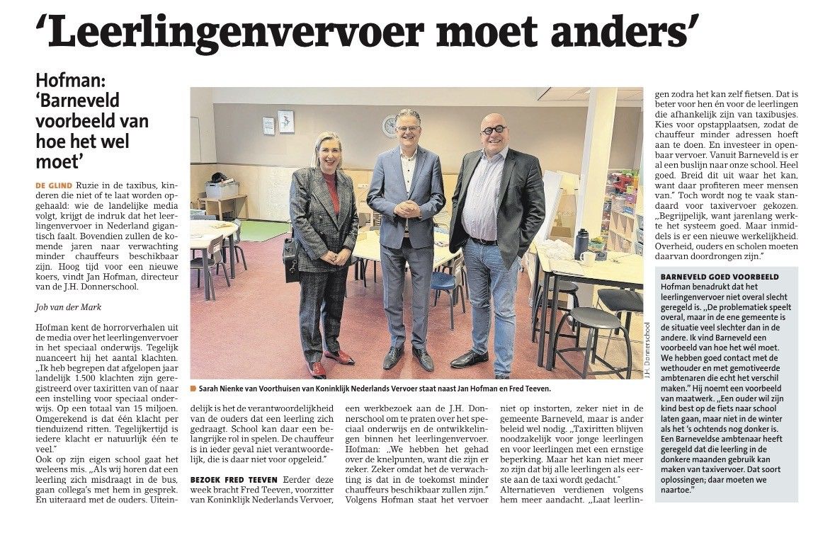 Vorige week waren zowel Hofman als Teeven nog als spreker aanwezig op het congres Leerlingenvervoer in Nijmegen. Tijdens het bezoek aan de J.H. Donnerschool werd dan ook stilgestaan bij het belang van goed georganiseerd en professioneel leerlingenvervoer, zeker voor leerlingen in het speciaal onderwijs. Fred Teeven: “Het is belangrijk dat we niet over elkaar praten, maar met elkaar, binnen het leerlingenvervoer. Zo komen we gezamenlijk tot goede oplossingen”.